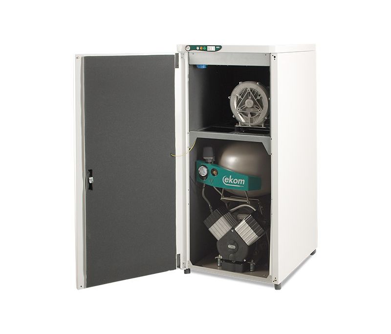 Безмаслянный компрессор EKOM с отсасывающим агрегатом серии DUO 2V являются источниками чистого сжатого воздуха, несодержащего масляных капельных включений, который предназначен для приведения в действие зубоврачебных приборов и устройств, а также для создания пониженного давления в отсасывающем агрегате. Благодаря своим параметрам и размерам резервуара воздуха объемом 25 л и наличию отсасывающего агрегата, компрессор этого типа может обслуживать одну или две стоматологические установки.