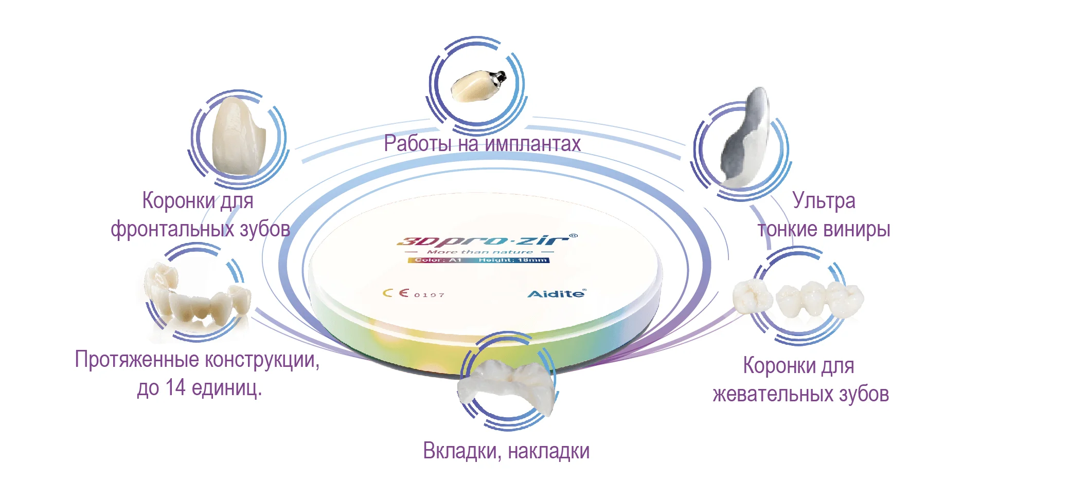 Переход прочности от 1050 Мра до 700 Мра предотвращает истирание антагонистов. Высокая прочность в базовых слоях диска позволяет применять 3D PRO для создания протяженных мостовидных конструкций.